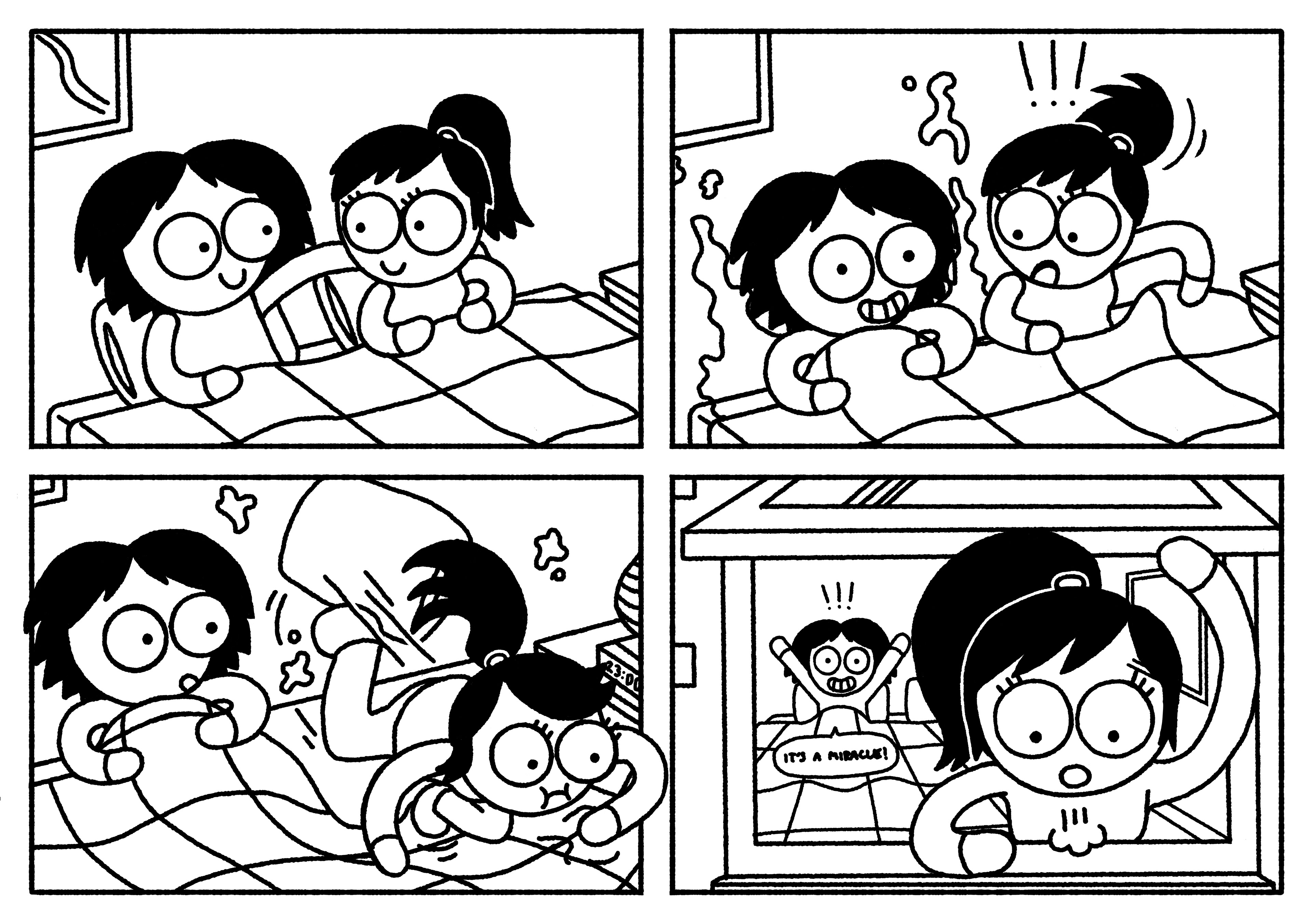 This is another comic relief page about me helping my girlfriend recover from an injury, by emitting such a terrible fart that she has to get out of bed. I've yet to add the text boxes. It was drawn in Procreate on the iPad.