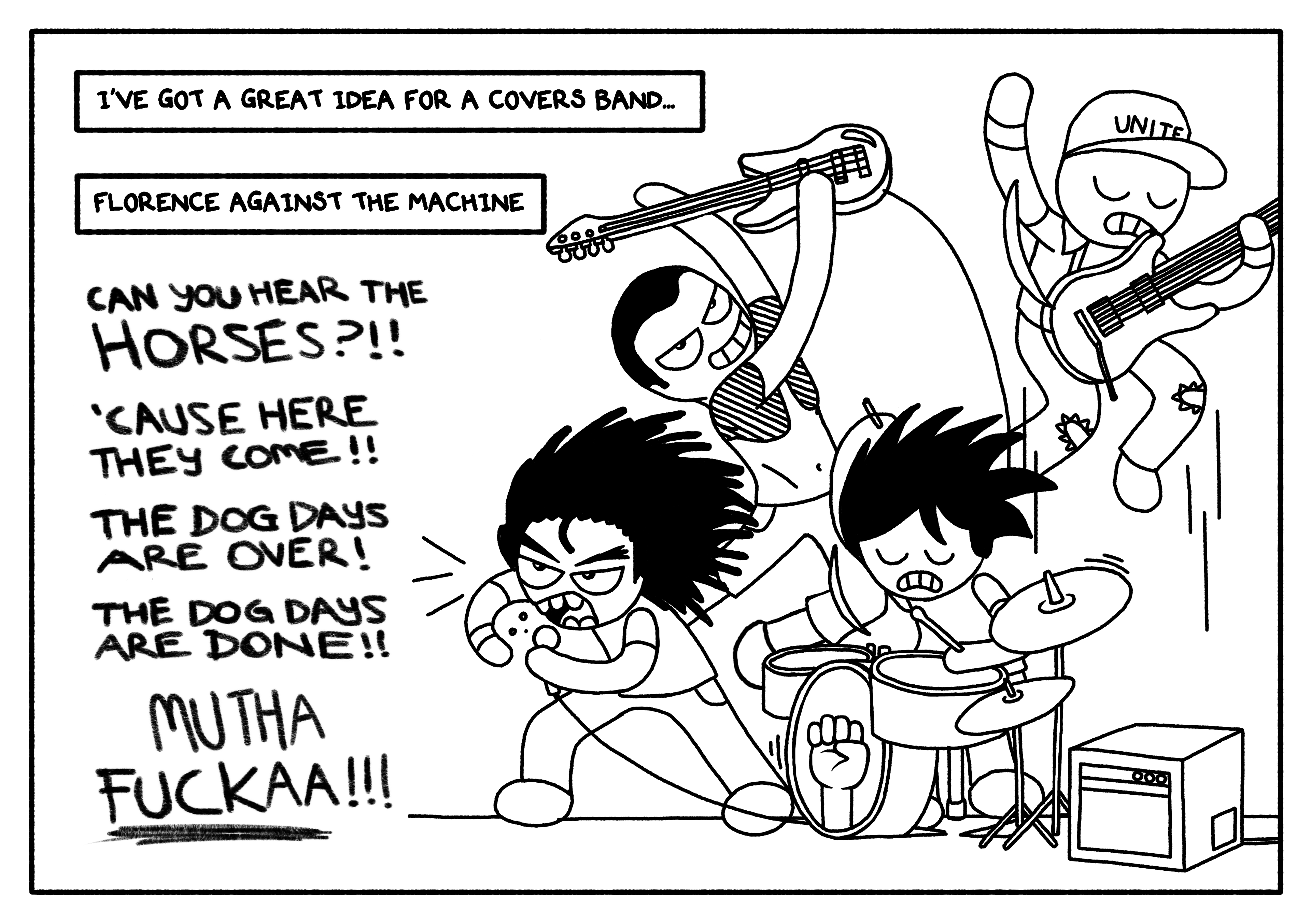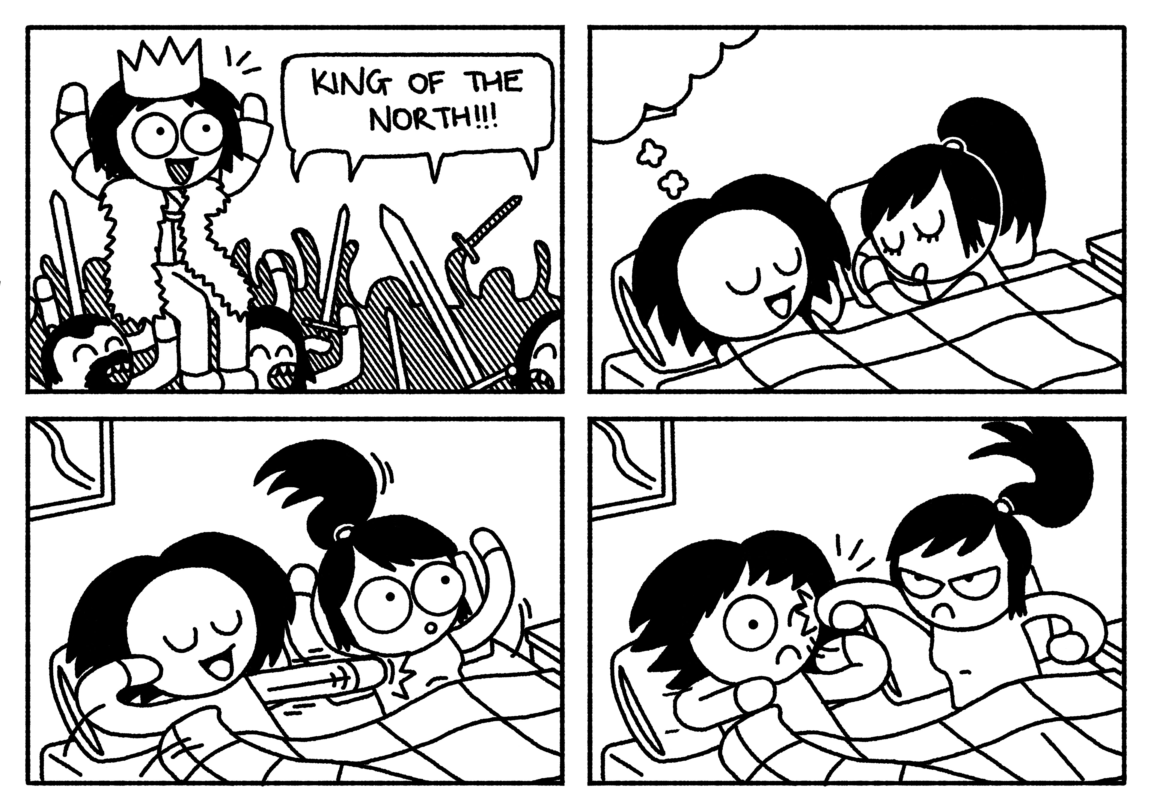 This page is towards the end of the book, when I have recovered from insomnia. It depicts me having dream about being hailed 'King of the North' (from Game of Thrones) and accidentally punching my girlfriend whilst acting it out.