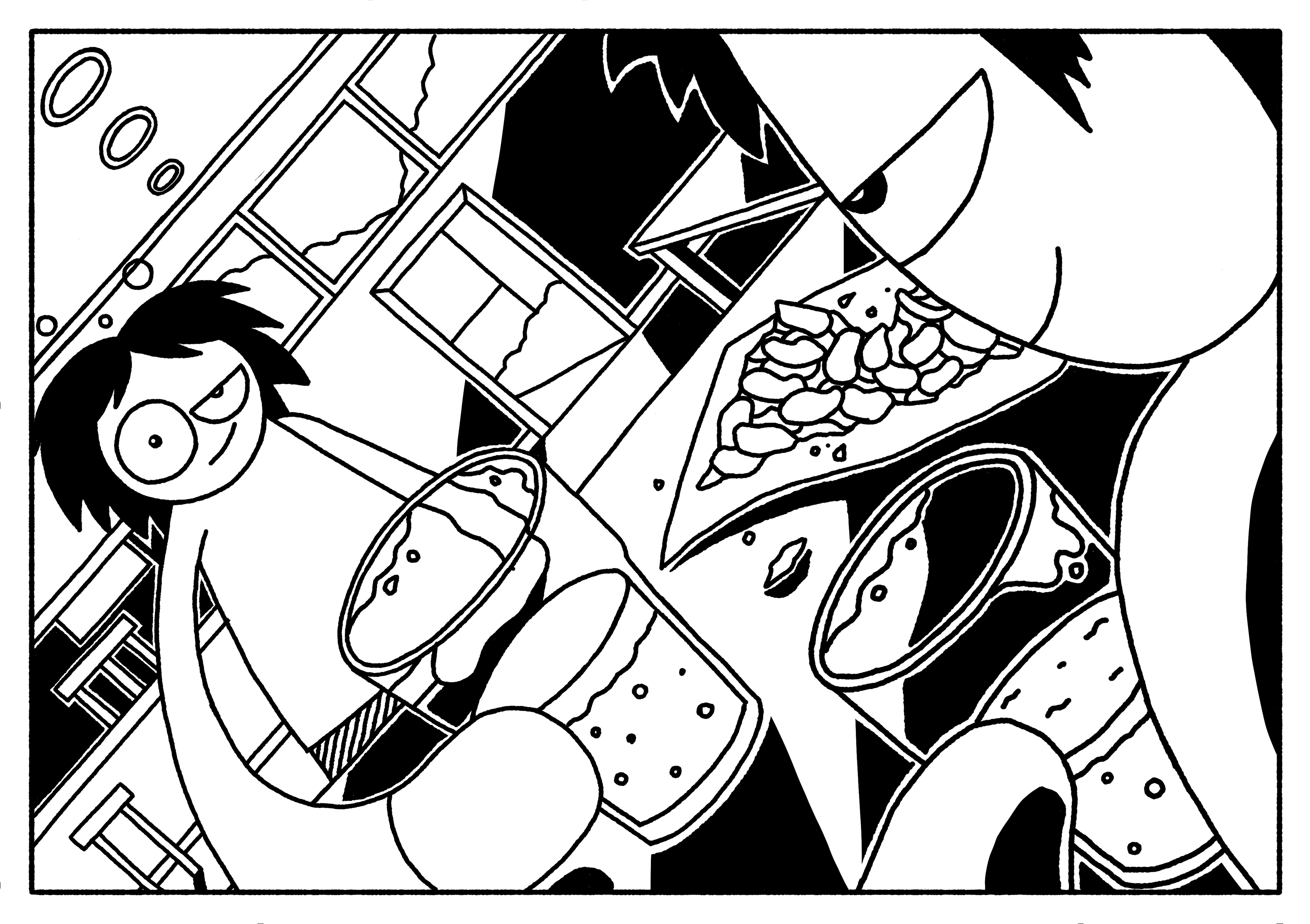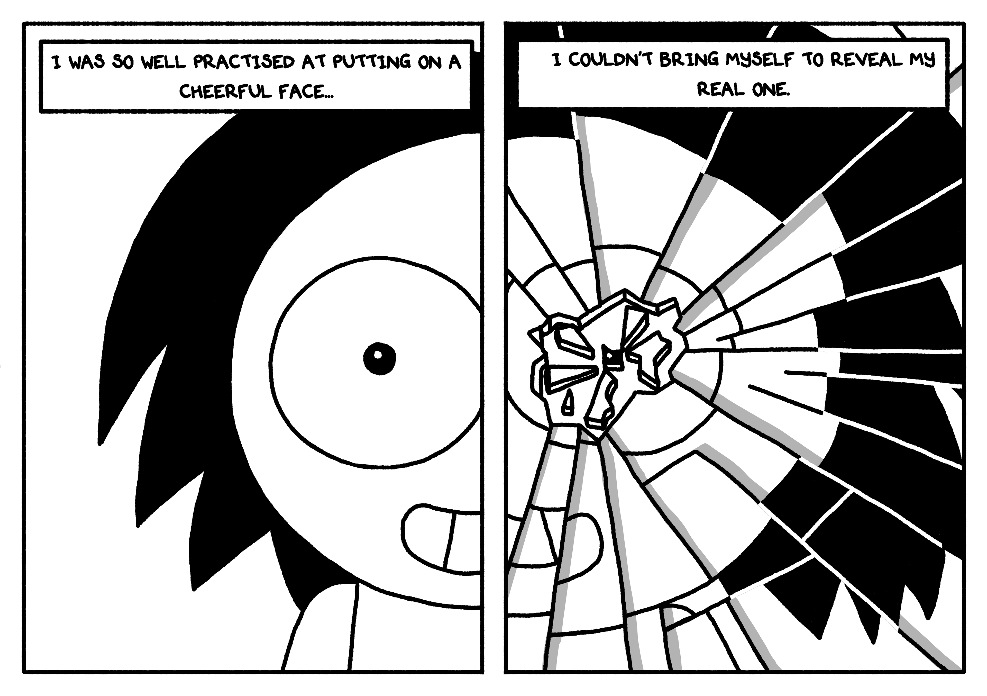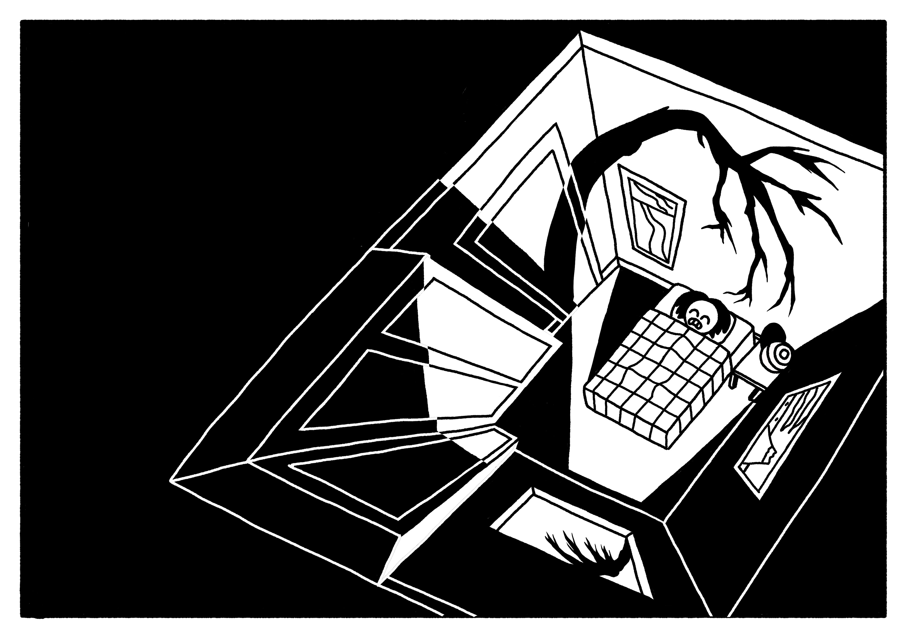 On this page I tried to depict what a night terror feels like. In the speed drawing video, you can see me work through some quite derivitive ideas, before I come up with something better. I've yet to add the text boxes. It was drawn in Procreate on the iPad.
