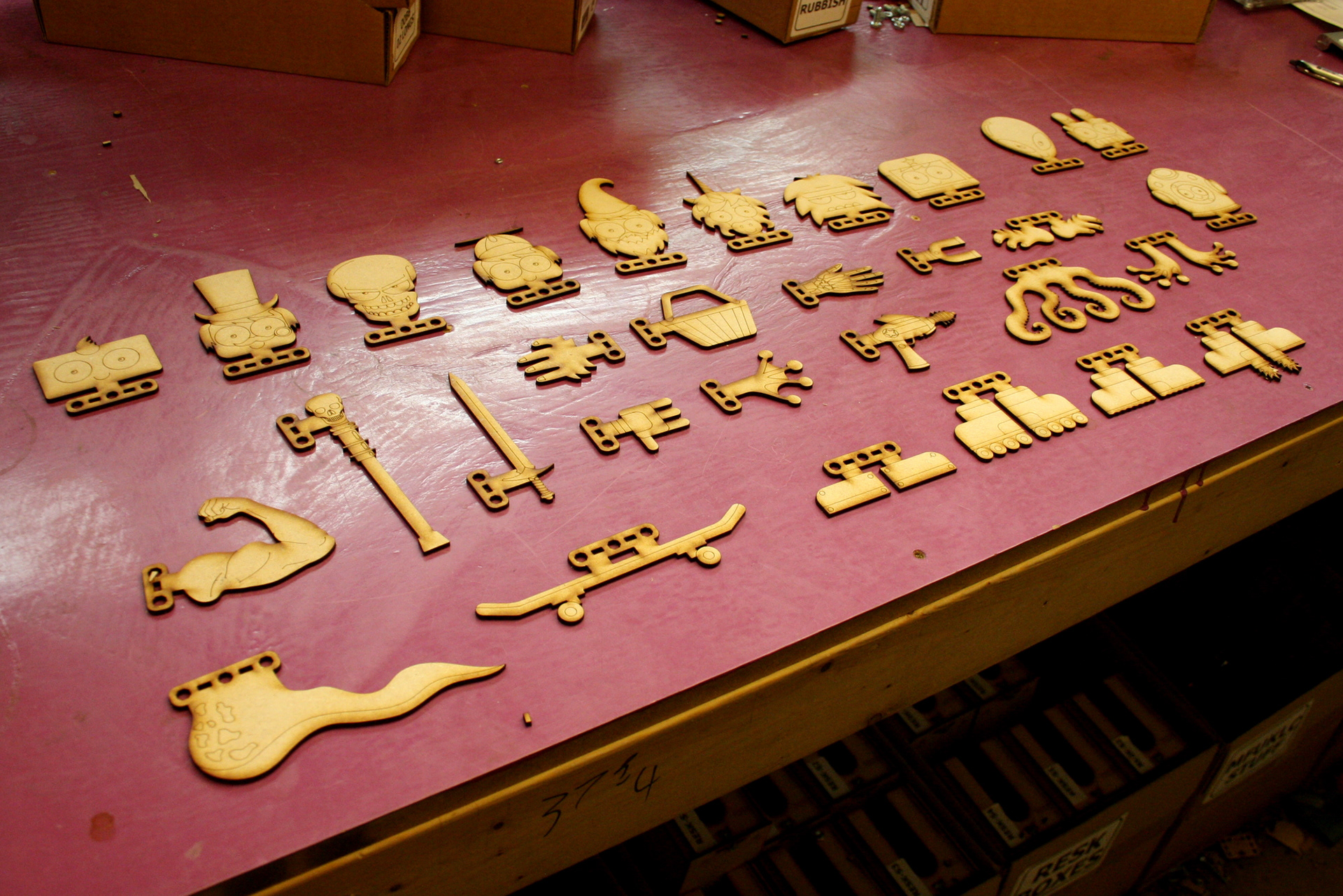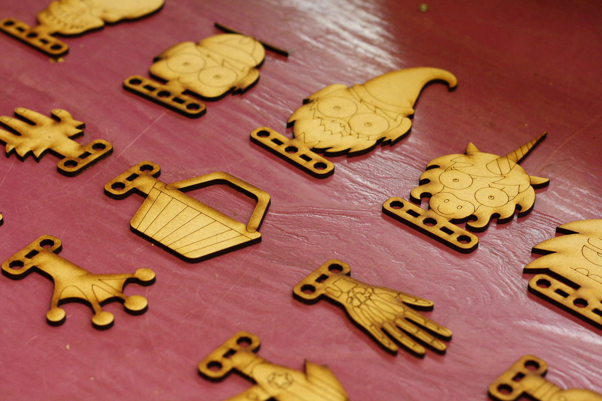 I was comissioned by Oomlout to design the arms, legs and heads for the UK Maker Faire badges in 2015. They were then laser cut and given to delegates, to mix and match.